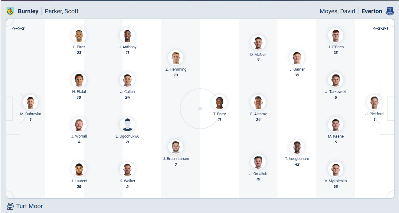 Burnley mới thăng hạng mùa này, họ quyết tâm trụ hạng và có khởi đầu mùa giải khá ổn. Tuy nhiên trong khoảng thời gian gần đây đội bóng của HLV Scott Parker không còn chơi tốt như trước, họ liên tục để thua và với 11 điểm đang có thì đã rơi xuống vị trí thứ 19 trên bảng xếp hạng. Khoảng cách với vị trí trụ hạng là 7 điểm, khoảng cách không hề nhỏ khiến nguy cơ xuống hạng của Burnley trở nên rất cao. Sau chuỗi trận thua liên tiếp, Burnley rất cần một chiến thắng để xốc lại tinh thần các cầu thủ. Dù rất muốn thắng nhưng có lẽ trước một Everton mạnh hơn thì nhiều khả năng Burnley sẽ chỉ có được kết quả hòa.